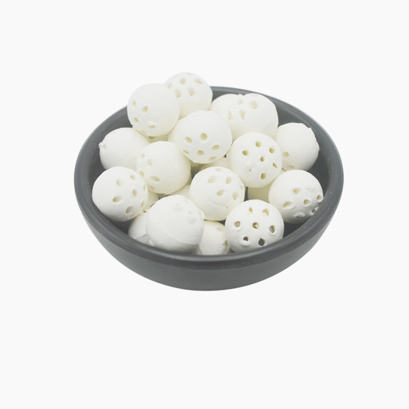 • 开孔瓷球更具有可以使净化器反应器中的流体均匀分布,使传质传热反应均匀和高效的进行。不使反应物和热量集中、大量地出现于局部地方,防止塔器某些地方反应过于集中,某些地方反应不充分,并防止催化剂过热、烧焦、缩短使用寿命。