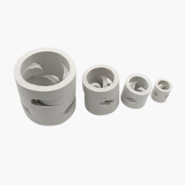陶瓷鲍尔环填料是在陶瓷拉西环的基础上开发的一种高径相等的开孔环型填料,每层窗孔有5个舌叶,每个舌叶内弯指向环心,上下两层窗孔的位置相反错开,一般开孔面积约占环壁总面积的30%左右,使得填料塔内的气体和液体能够从窗孔自由通过,改善了气液分布,充分利用了环的内表面。