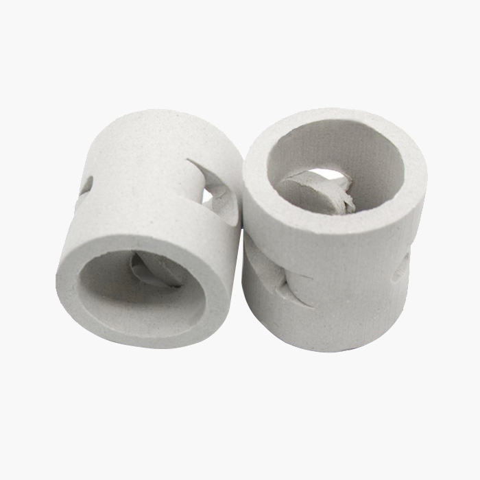 陶瓷鲍尔环填料是在陶瓷拉西环的基础上开发的一种高径相等的开孔环型填料,每层窗孔有5个舌叶,每个舌叶内弯指向环心,上下两层窗孔的位置相反错开,一般开孔面积约占环壁总面积的30%左右,使得填料塔内的气体和液体能够从窗孔自由通过,改善了气液分布,充分利用了环的内表面。