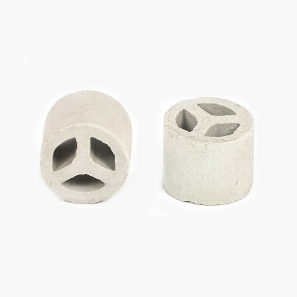 陶瓷三丫环填料是一种经外观独特设计加工成的一种新型高效散堆填料,产品高径比约为2:1,内部设有一个或三个“Y”型隔板,这样增大比表面积,提高了汽液分散性能,使汽液接触更充分。三丫环填料是从阶梯环、共钜环、扁环、矩鞍环的基础上以及在形状、外观和结构综合考虑,进行取长补短而改进的。