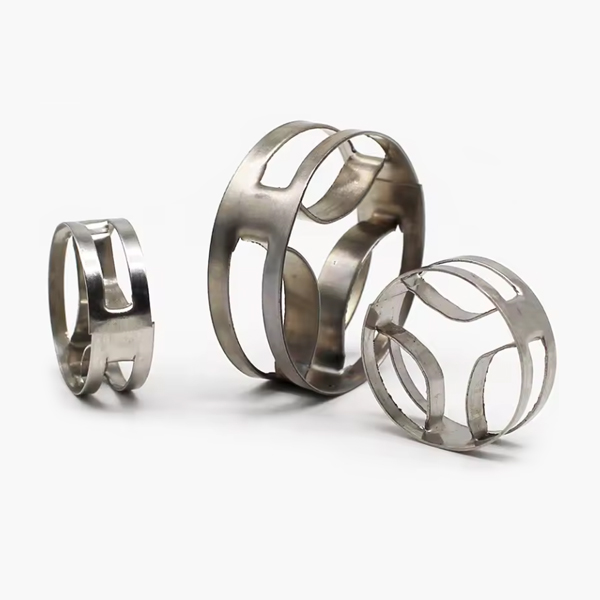 金属扁环填料是一种短开孔环型填料。其高、径比达到大约1/3,扁环填料在结构上与阶梯环相似,取消了阶梯环的翻边,采用内弯弧形筋片来提高填料强度,在乱堆时能有序排列,流道结构合理,压降低,在处理能力和传质性能上均有所改善。确保填料堆积时统一朝向,增加了堆密度,内弯弧筋片使填料层内气液分布更加 均匀,大大提高了分离效果,具有传质交率高、床层阻力低、自理能力大、返混夹带小、不易结垢等优点。
