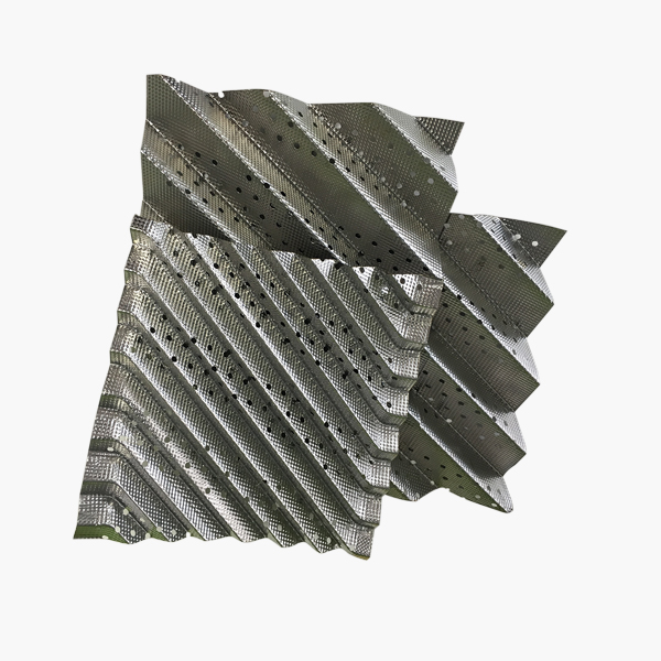 金属孔板波纹填料是在金属薄板表面开孔、轧制小纹、大波纹最后组装而成的规整填料,具有阻力小、气液布均匀、效率高、能量大、放大效应不明显等特点,应用于负压、常压和加压操作。